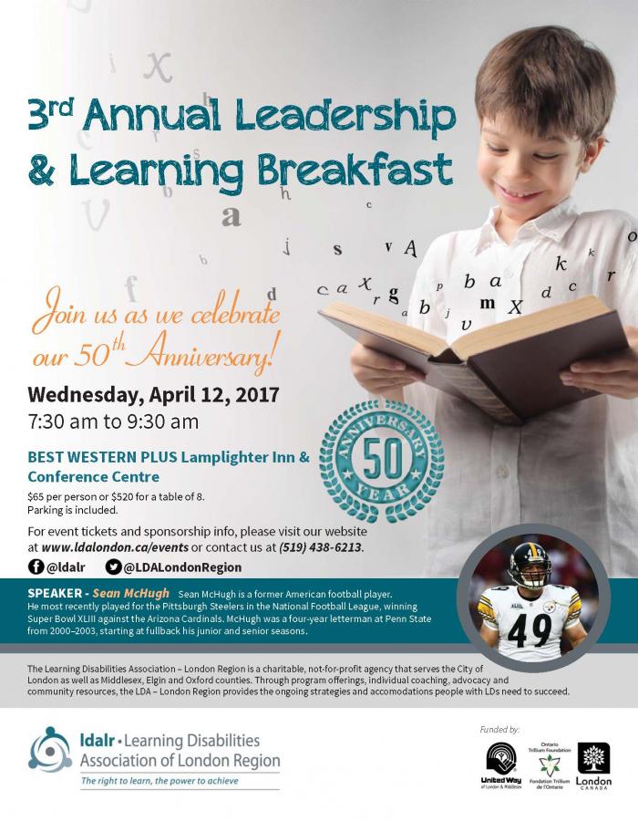 On Wednesday, April 12, 2017, the Learning Disabilities Association of London Region will be holding its 3rd Annual Leadership and Learning Breakfast at the Best Western Plus Lamplighter Inn & Conference Centre. The breakfast includes not only delicious food, but also inspiring insight from individuals that have embraced their learning disabilities (LDs) and pushed boundaries to be successful.