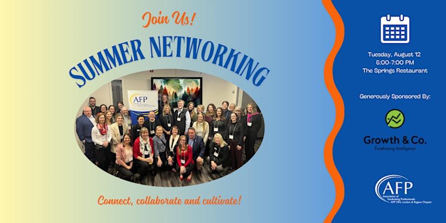 AFP London & Region invites all members and not-yet members to come together for a summer networking event. This is an opportunity for local fundraising and non-profit professionals to connect with friends and colleagues, new and old.