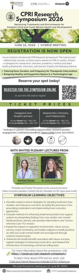 You're invited to the biennial CPRI Research Symposium! On June 16, 2026, we will focus on Optimizing Treatments and Environments for Complex Child and Youth Mental Health and Development. This hybrid event—offered virtually via Zoom and in-person at Zarfas Hall (CPRI) in London, Ontario—is designed for researchers, clinicians, academics, medical and allied health professionals, educators, and learners.