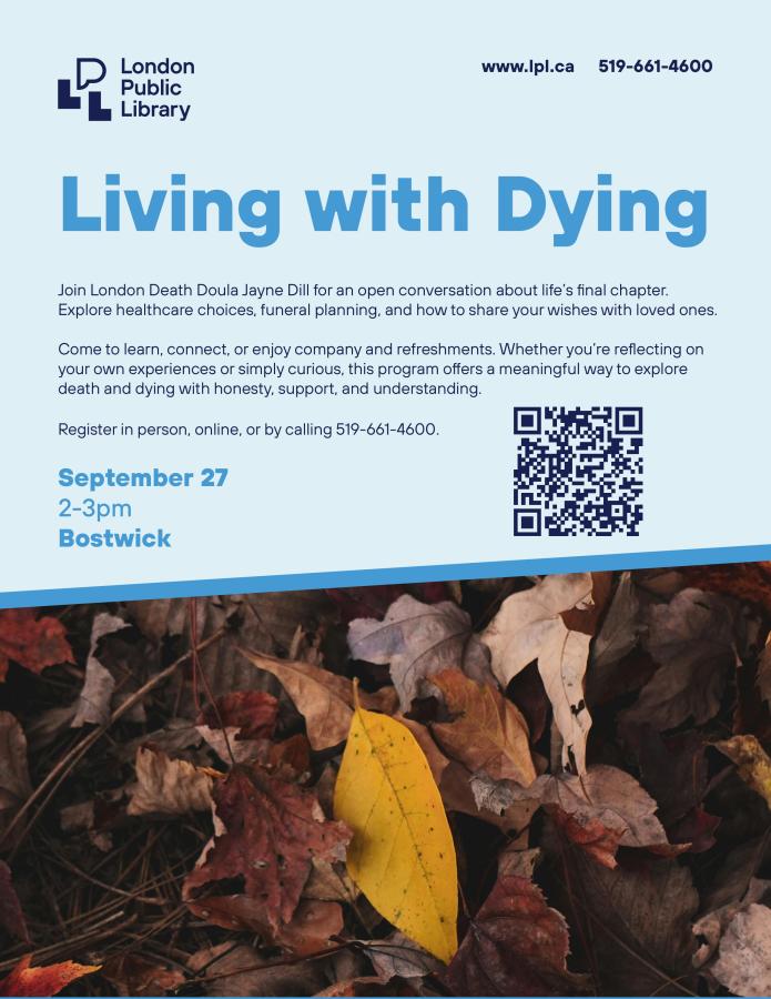 Join Death Doula Jayne Dill for an open conversation about life's final chapter. Explore healthcare choices, funeral planning, and how to share your wishes with loved ones. Come to learn, connect, or just enjoy company and refreshments. Register online through Eventbrite or drop in.