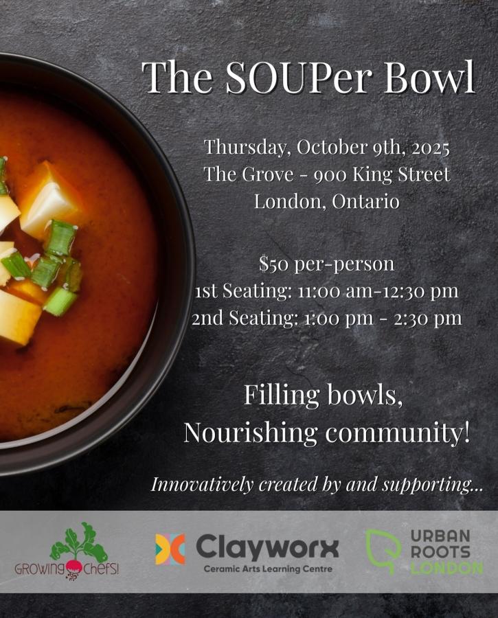 On Thursday, October 9, 2025, three London-based non-profits—Growing Chefs! Ontario, Urban Roots London, and Clayworx: Ceramic Arts Learning Centre—will come together to host the inaugural SOUPer Bowl at Growing Chefs! at The Grove. This innovative fundraising event combines food, art, and community collaboration to tackle local food insecurity and to support London artists in a new and sustainable way.