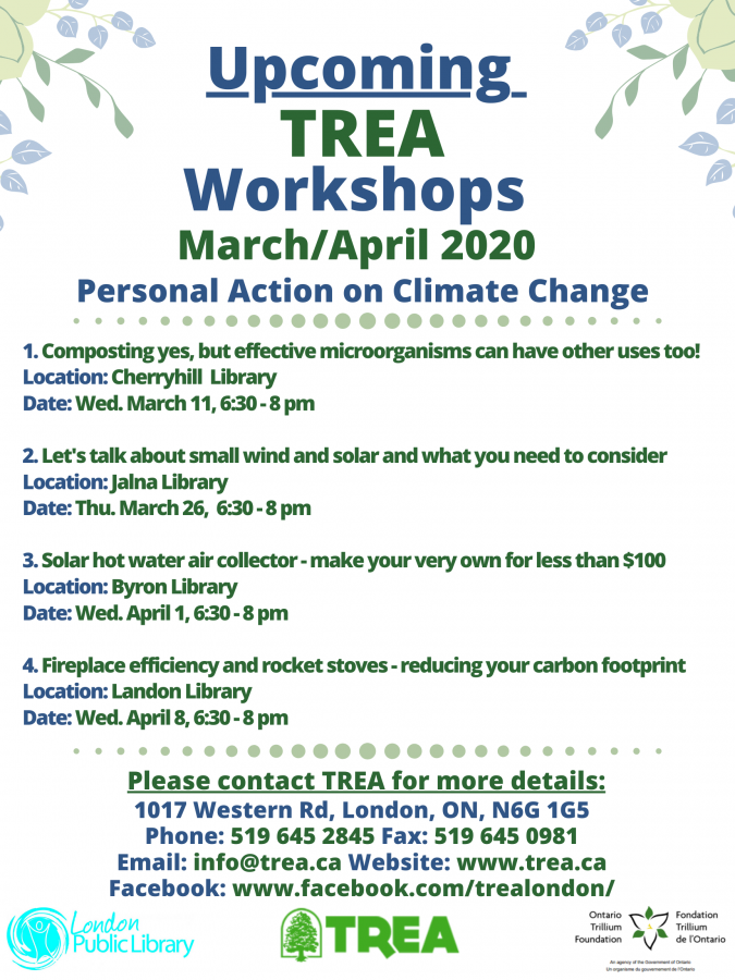 Climate change is here, we see the impacts as extreme weather events become more frequent, and the temperature rises. The time to take action is now. The public is invited to attend the Thames Region Ecological Association’s FREE how-to workshop series on taking personal action against climate change. Reducing the amount of greenhouse gases we emit is key to preventing climate change and supporting future generations.