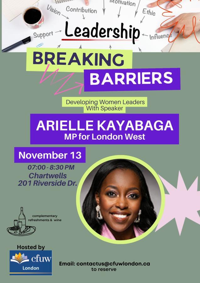 Please join us for a free an informative, fun and engaging evening with speaker: Member of Parliment, Arielle Kayabaga as she relates her journey from Londoner to Elected Official for the Government of Canada.